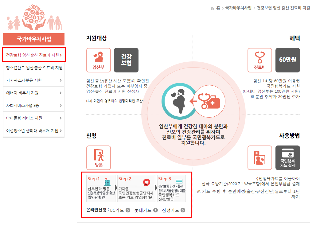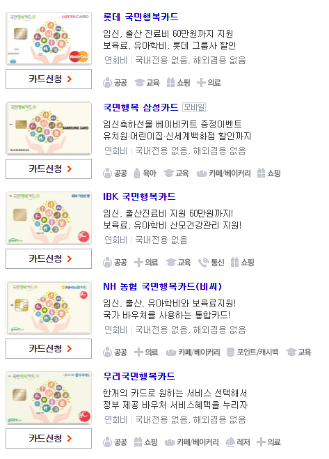 방문신청과 온라인 신청이 있는데요 방문신청은 BC카드사 또는 삼성카드, 롯데카드, 국민건강보험공단 지사에 방문하시면 되구요 국민행복카드 사이트 접속하시면 각 카드사에서 온라인 신청 가능합니다.